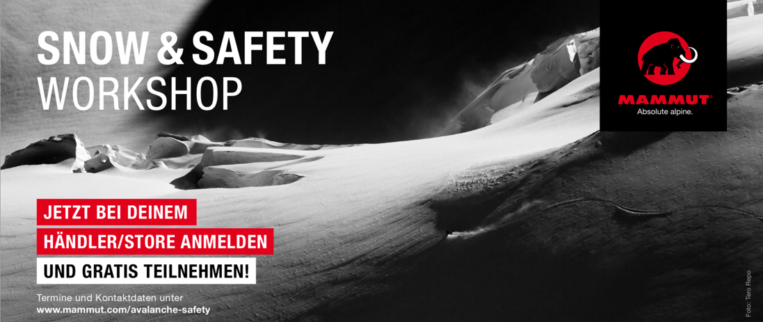 Mammut: Mit dem "Snow & Safety Workshop" bieten wir einen Workshop der sich zu 100 Prozent lohnt. Erhöhe deine Sicherheit bei Skitouren, Tiefschneevergnügen und Schneeschuhwandern!