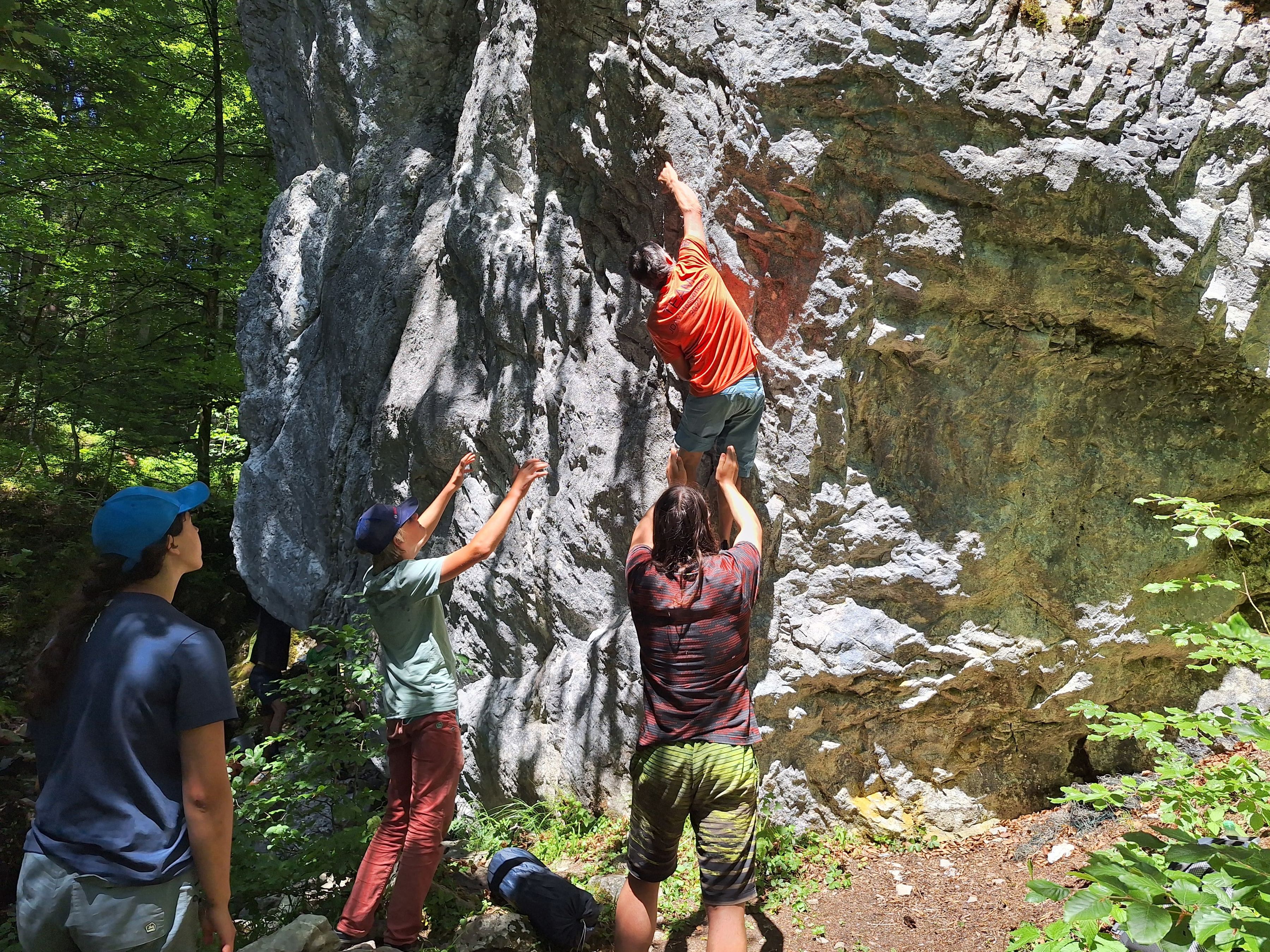 Am letzten Tag ging es nach dem Zusammenpacken und Tetris spielen mit Rucksäcken im Stauraum des Autos zu einem See, an dem wir zwar nicht baden, aber noch ein paar Boulder erschließen konnten. Für den Großteil der Gruppe ging es mit der Bahn wieder zurück und wir sind abends reibungslos wieder in Frankfurt angekommen. Die Ausfahrt hat allen Lust auf mehr gemacht und motiviert uns für die kommenden Wochen und Monate in der Halle und am Fels weiter durchzustarten.
