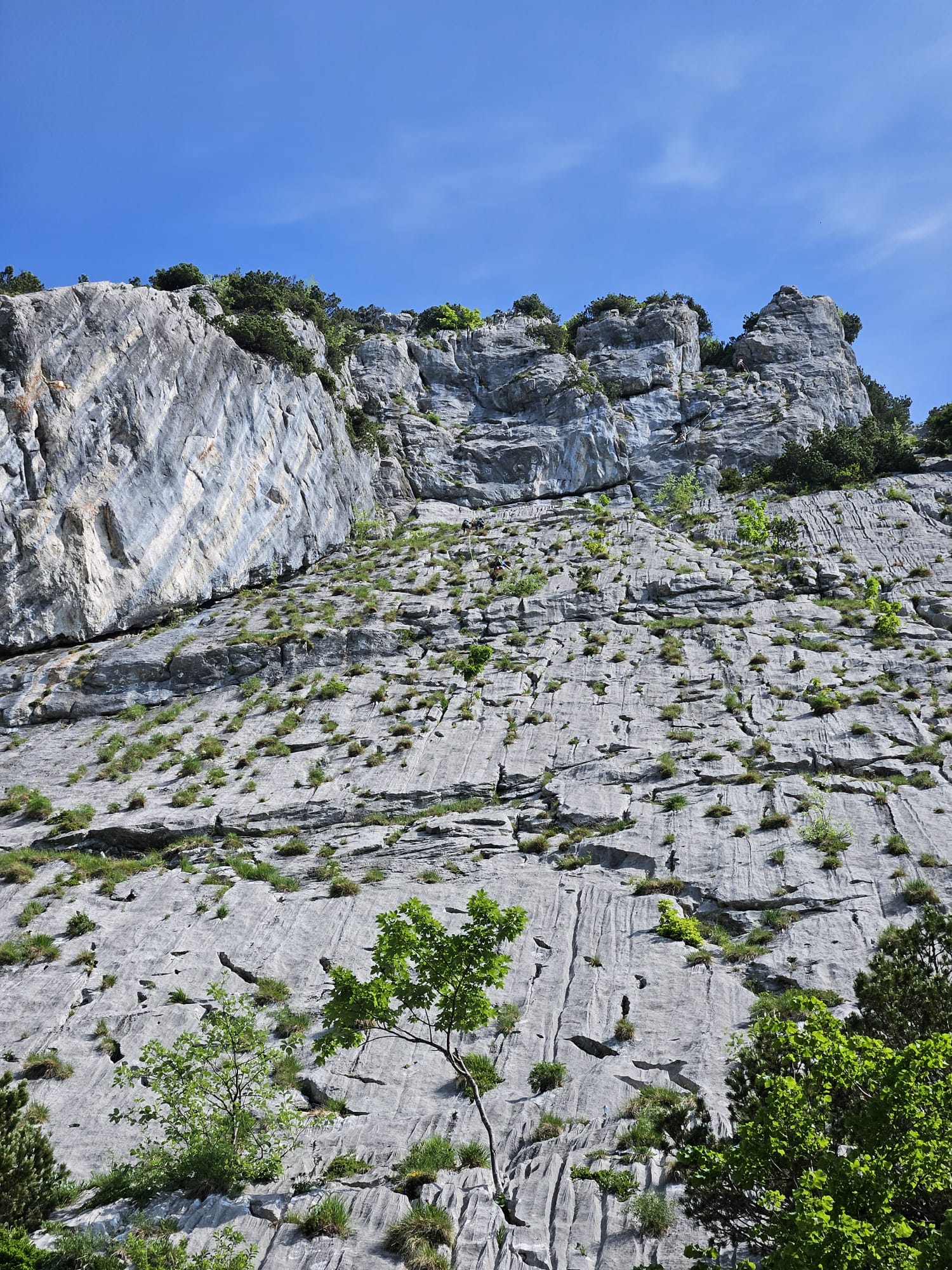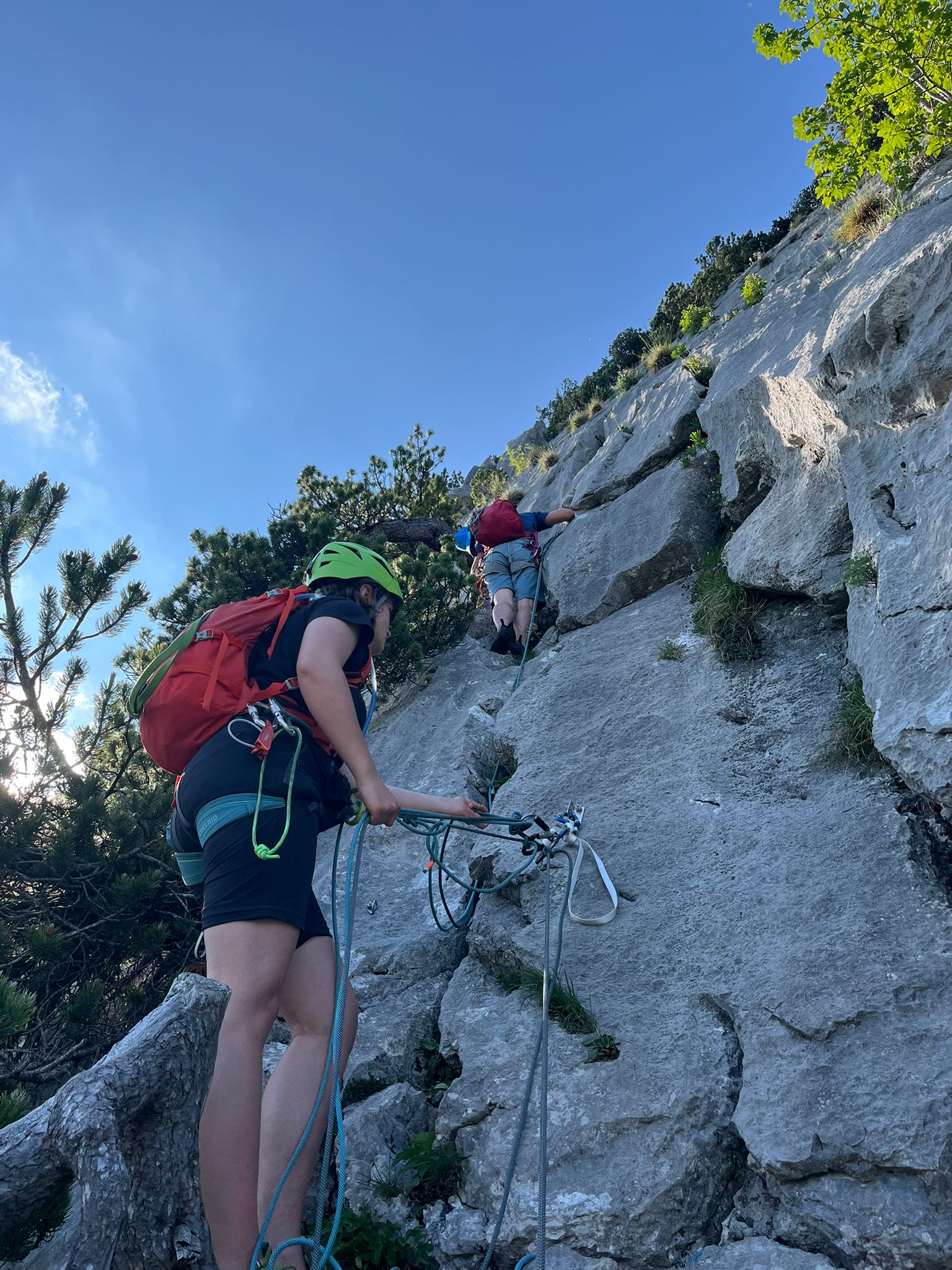 Am nächsten Morgen haben wir ein letztes Mal die Stand- und Sicherungstechniken geübt und dann ging es los zum Brüggler, der ca. 1h zu Fuß von unserem Campingplatz entfernt lag. Dort wartete eine bis zu 200m hohe, leicht positive Kalkwand auf uns. Schnell wurden die Seilschaften eingeteilt und es ging los in die ersten Routen. In der prallen Sonne konnten wir drei Tage lang in unterschiedlichen Schwierigkeitsgraden Sicherungstechniken, Routenfindung und in Seilschaften klettern üben.