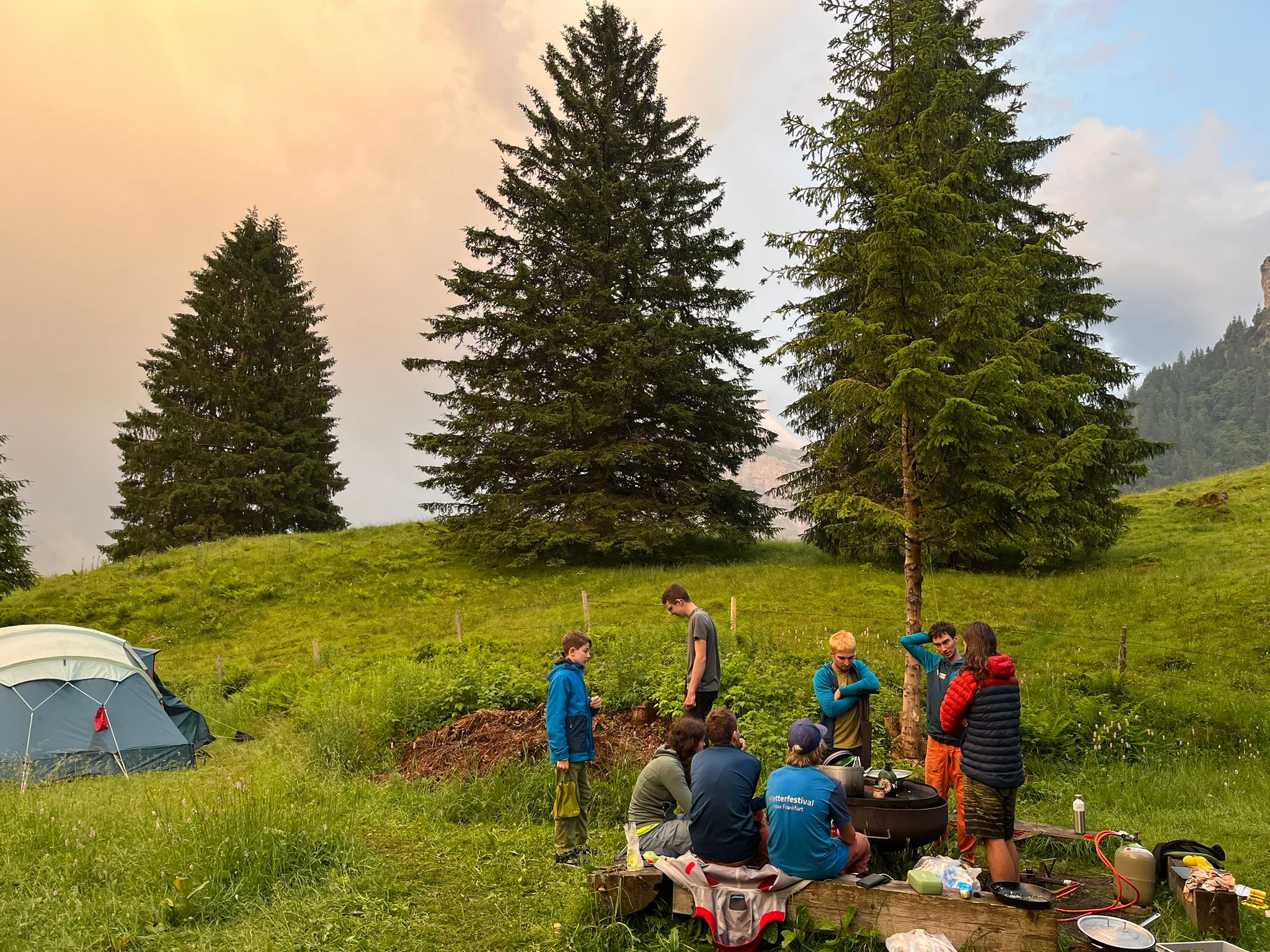 Nach einer langen Zugfahrt und einem zähen Aufstieg kamen wir am Campingplatz an und haben uns gleich einen schönen, ruhigen Ort für unsere Zelte gesucht. Während die einen mit Aufbauen beschäftigt waren, haben die anderen ein sehnlichst erwartetes Abendessen gekocht.